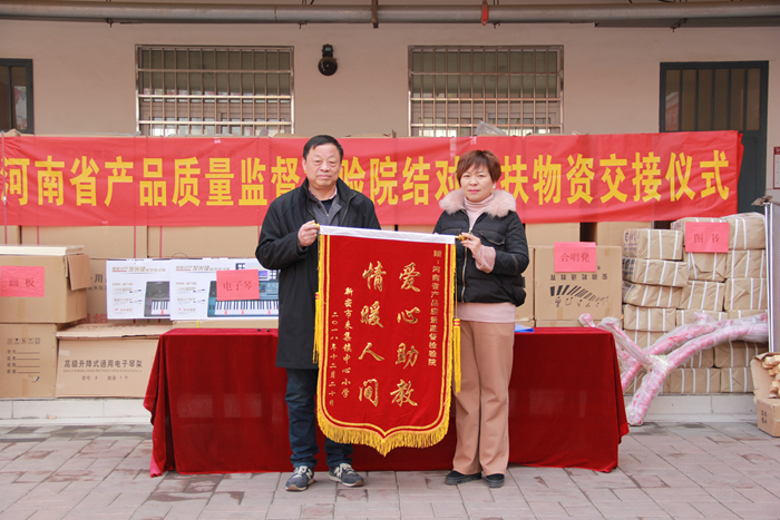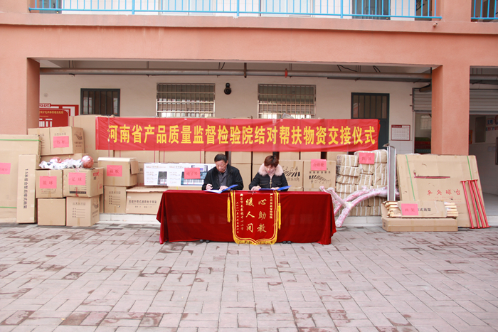 12月20日,河南省产品质量监督检验院结对帮扶来集镇中心小学物资交接仪式在新密市来集镇中心小学举行。河南省质检院党委书记苏涌、党办主任李存英、党办副主任肖征,来集小学校长马海霞出席了此次捐赠仪式。