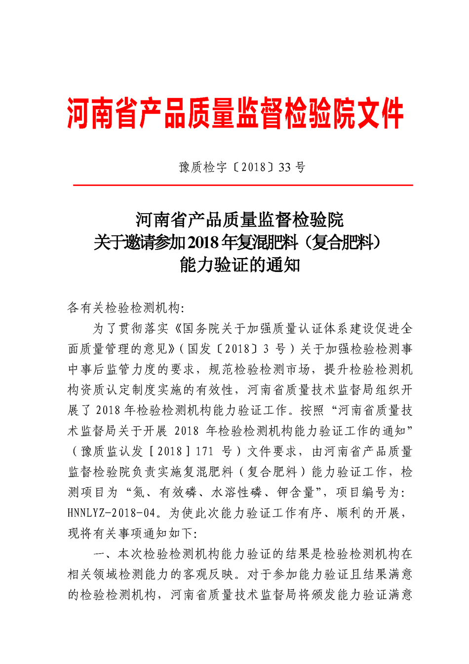 关于邀请参加2018年复混肥料(复合肥料)能力验证的通知 发布时间:2018年06月06日 信息来源:河南省产品质量监督检验院 作者:河南省产品质量监督检验院 编辑时间:2018/6/6 8:57:34 浏览 10516 人次