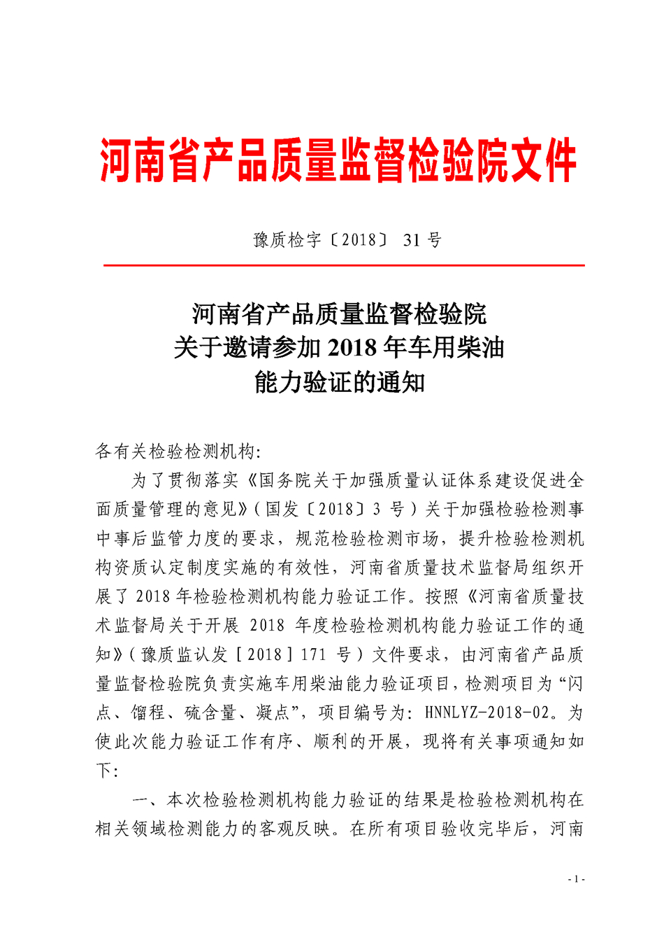 关于邀请参加2018年车用柴油能力验证的通知 发布时间:2018年06月06日 信息来源:河南省产品质量监督检验院 作者:河南省产品质量监督检验院 编辑时间:2018/6/6 8:53:51 浏览 9508 人次