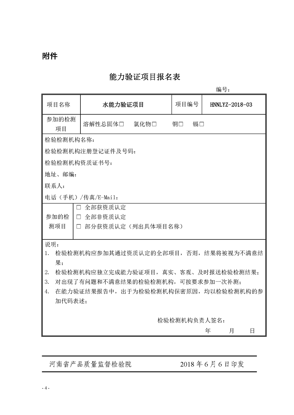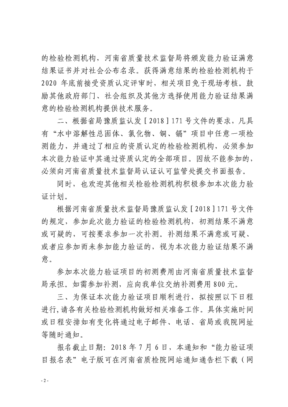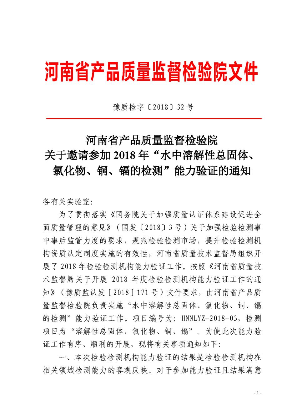 关于邀请参加2018年“水中溶解性总固体、氯化物、铜和镉的检测”能力验证计划的通知 发布时间:2018年06月06日 信息来源:河南省产品质量监督检验院 作者:河南省产品质量监督检验院 编辑时间:2018/6/7 11:19:26 浏览 11030 人次