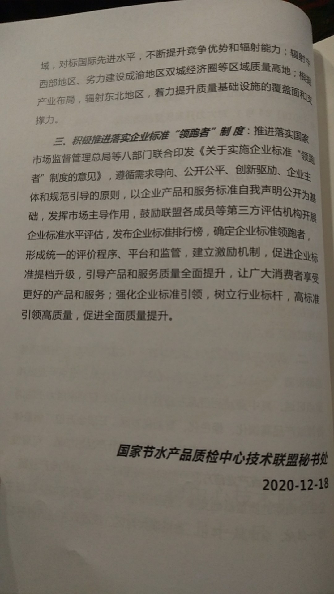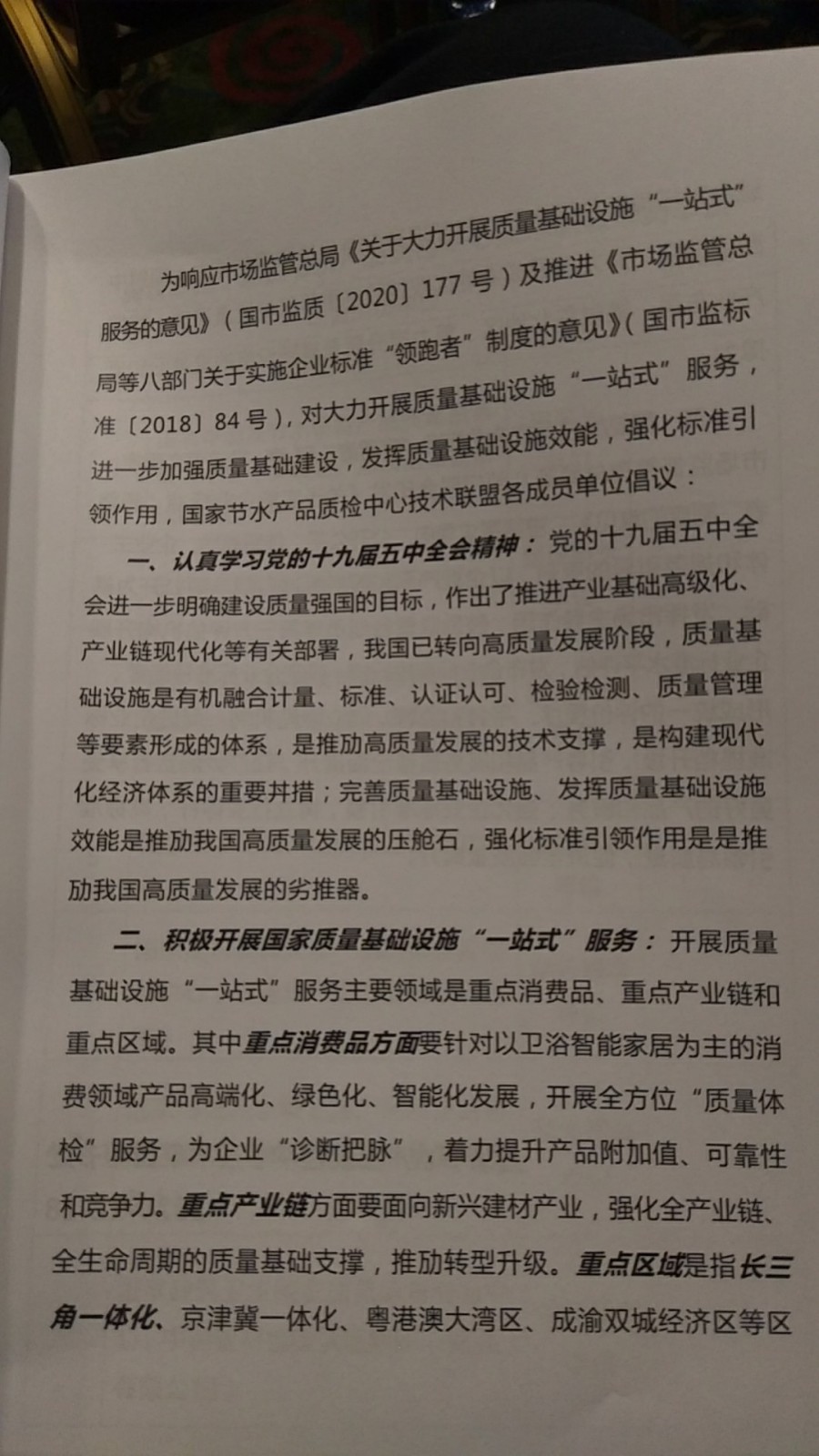 本次会议就“质量基础设施一站式服务建设”、“发挥质量基础设施效能,强化标准引领作用”、“实施企业标准领跑者制度”等内容进行了广泛的讨论和建议征集;会上国家节水产品质检中心技术联盟各成员单位一道发出三点倡议:认真学习党的十九届五中全会精神、积极开展国家质量基础设施“一站式”服务、积极推进落实企业标准“领跑者”制度。