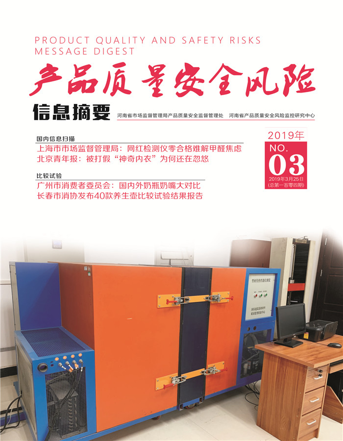 产品质量安全风险信息摘要2019.3.25 发布时间:2019年07月25日 信息来源:河南省产品质量监督检验院