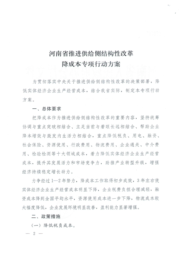 《关于印发河南省推进供给侧结构性改革降成本专项行动方案的通知》(豫政办〔2016〕96号) 发布时间:2016年07月03日 信息来源:河南省产品质量监督检验院