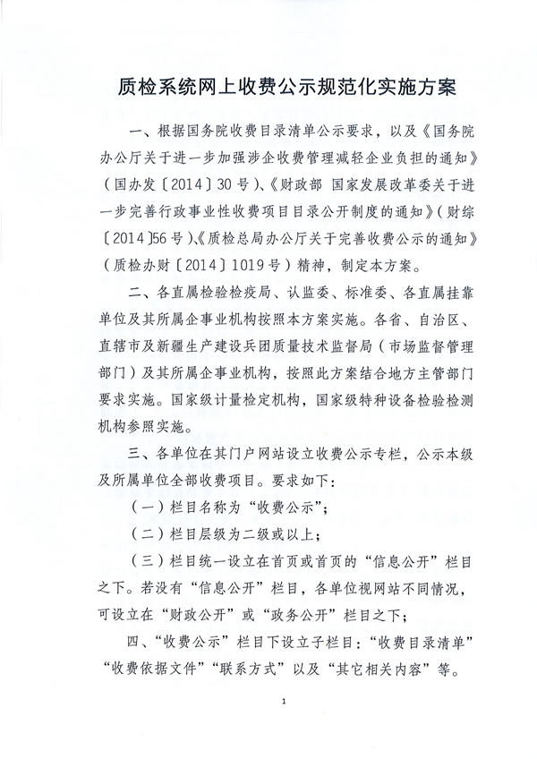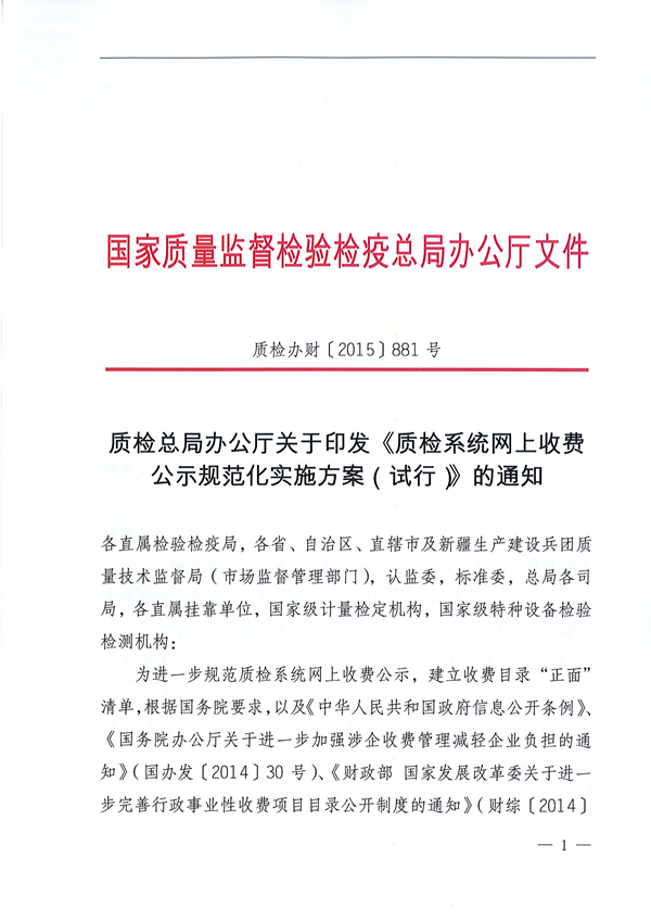 首页-- 收费依据文件>--《质检总局办公厅关于印发<质检系统网上收费公示规范化实施方案(试行)>的通知》(质检办财〔2015〕881号)