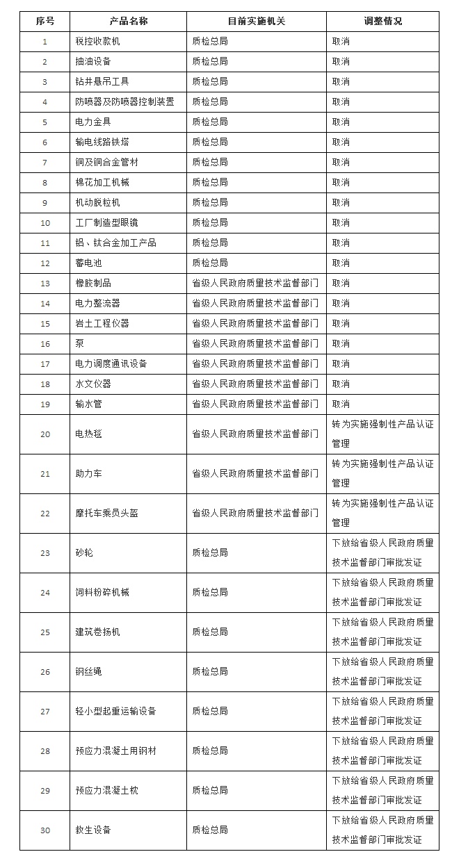 附件:1.工业产品生产许可证取消、转为实施强制性产品认证管理、下放管理权限的产品目录(共计30类)